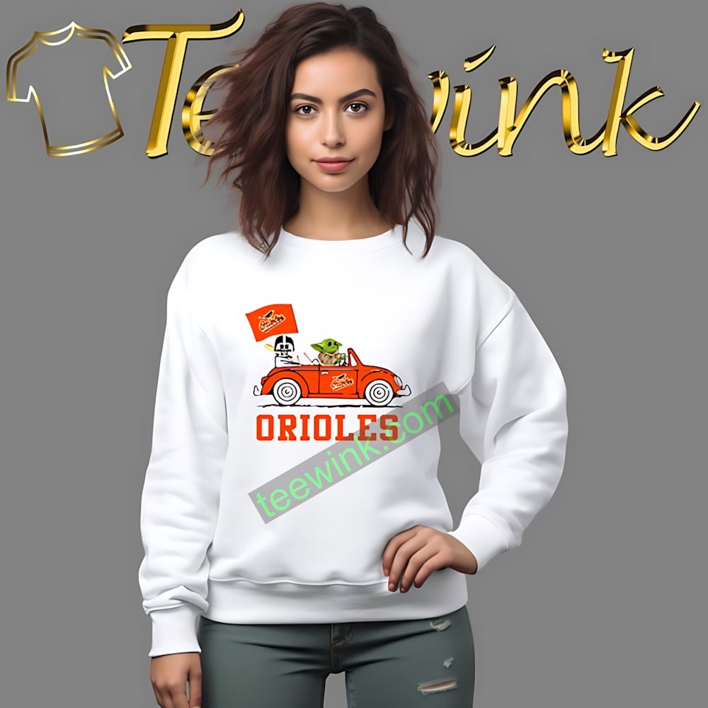 The MLB Baseball Baltimore Orioles Darth Vader Baby Yoda Driving Star Wars Shirt is a must-have piece for fans of baseball and the iconic Star Wars saga. Presented by Teewink, this unique tee blends the best of both worlds, featuring an eye-catching print of Darth Vader and Baby Yoda, two of the galaxy’s most beloved characters, on an exhilarating road trip adventure. Ideal for any MLB Star Wars fan tee collection, this shirt brings whimsy and fandom together in one stylish package.
